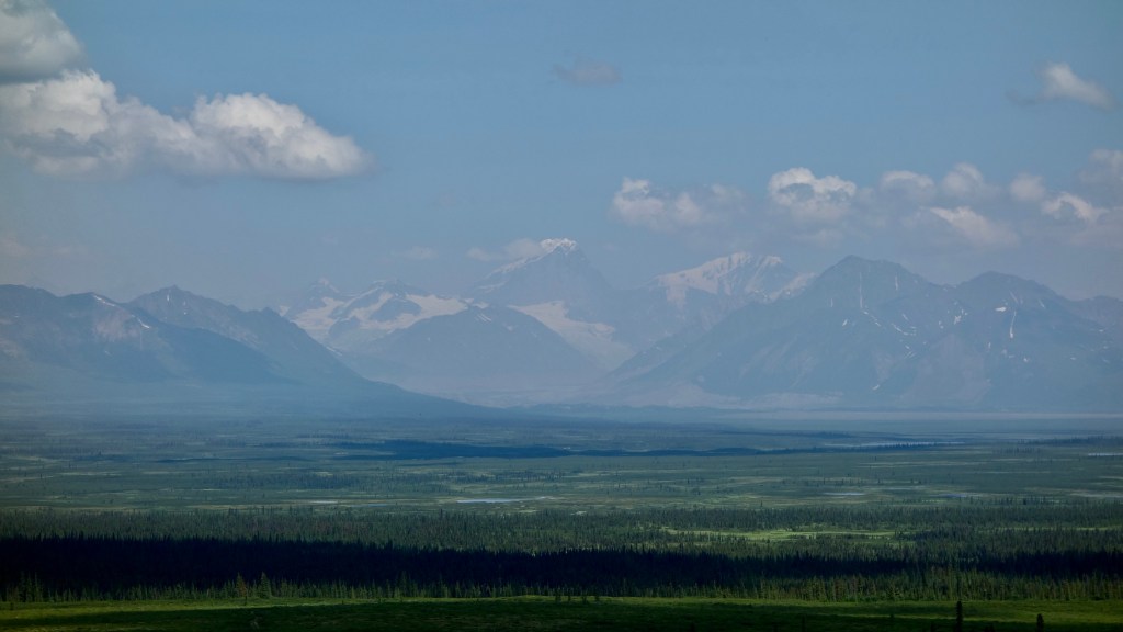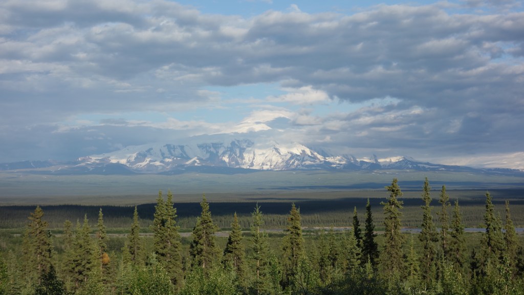 Back on the seemingly endless rolling roads again for a while but traffic was basically non existent and the views kept on delivering. The section of the Glen highway I rode follows the Wrangell Mountain range. A bunch of big old volcanos, and in some open areas out of the tree line it was all looking spectacular.