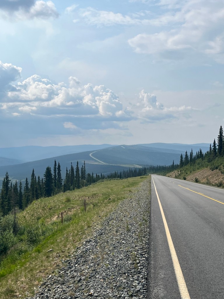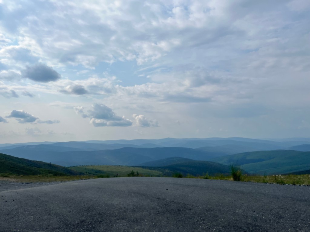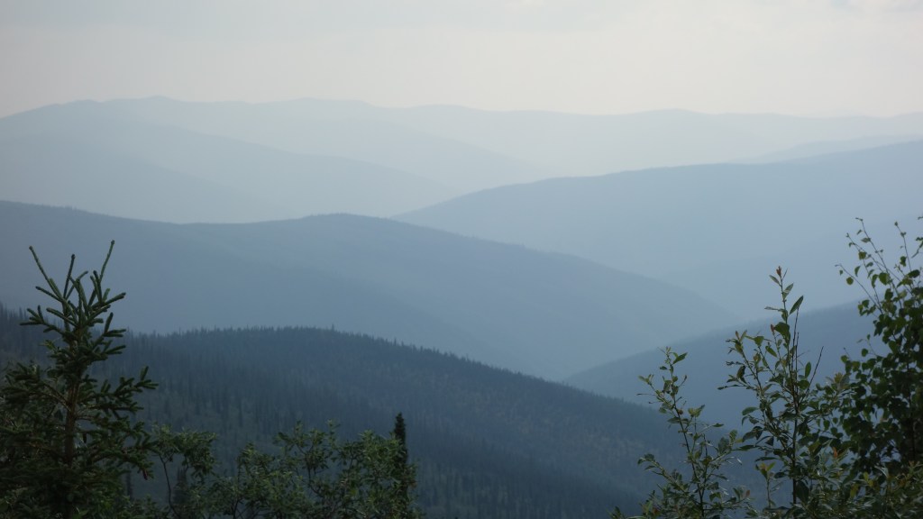 The road up to the Top of the World highway was tough, big climb and a drag on the rough gravel. It then turned to this beautiful flowing paved road and the views opened out to the valleys of trees below. There was still some haze from smoke in the air but I was doing well for weather really on this day.