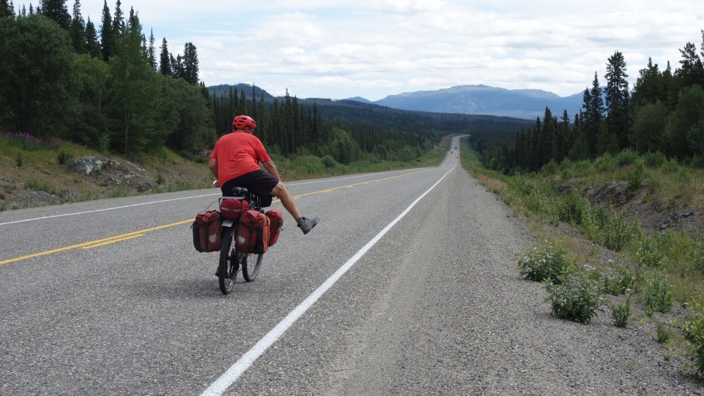 The next four days riding on this Klondike Highway were bloody tough. The headwind had picked up and there were long sections in a high tree line with nothing to see, it wasn’t inspiring. Music sometimes helps when it gets tough but my headphones had died so it was just good old fashioned mind games.