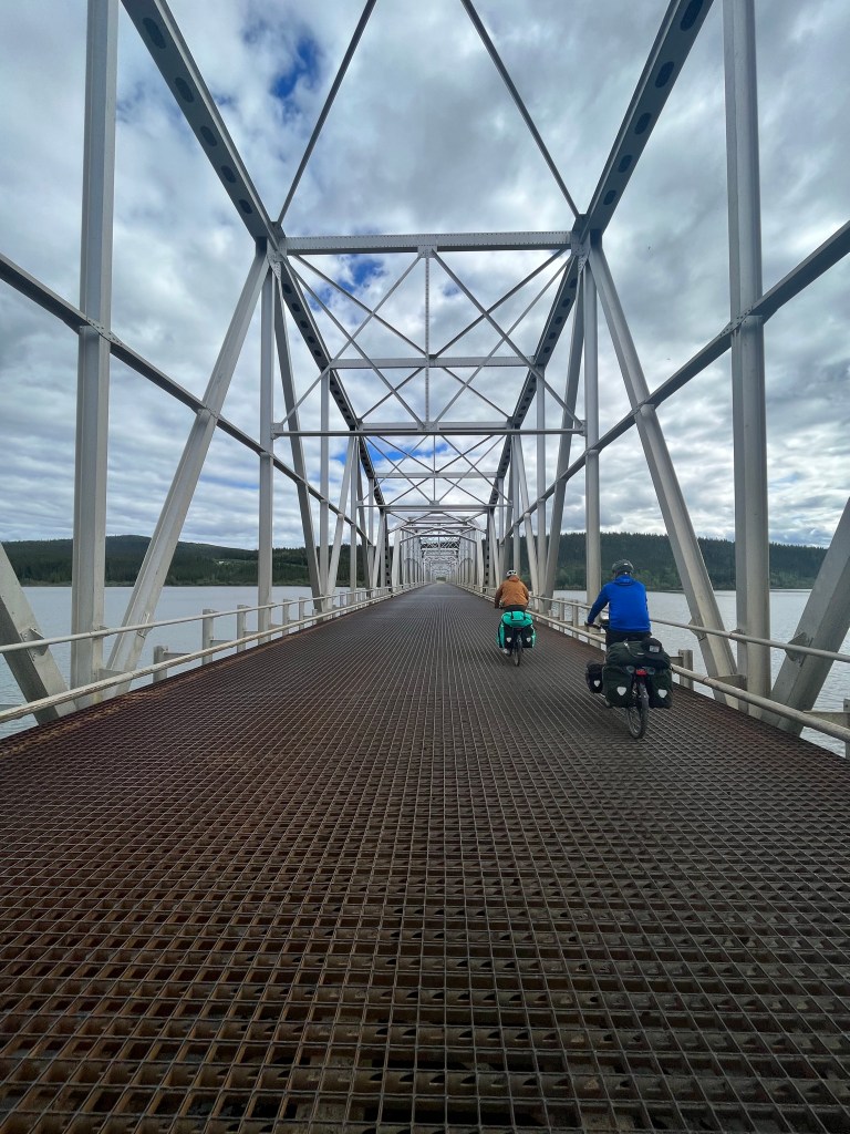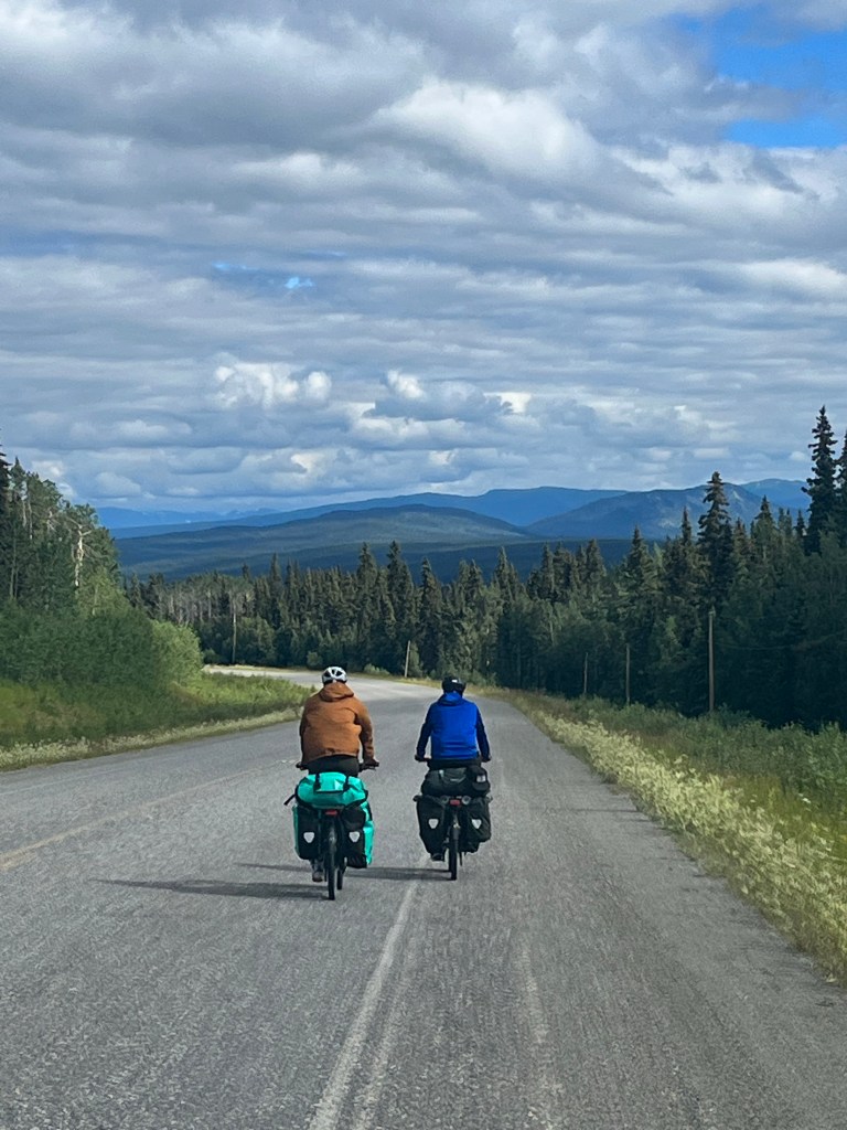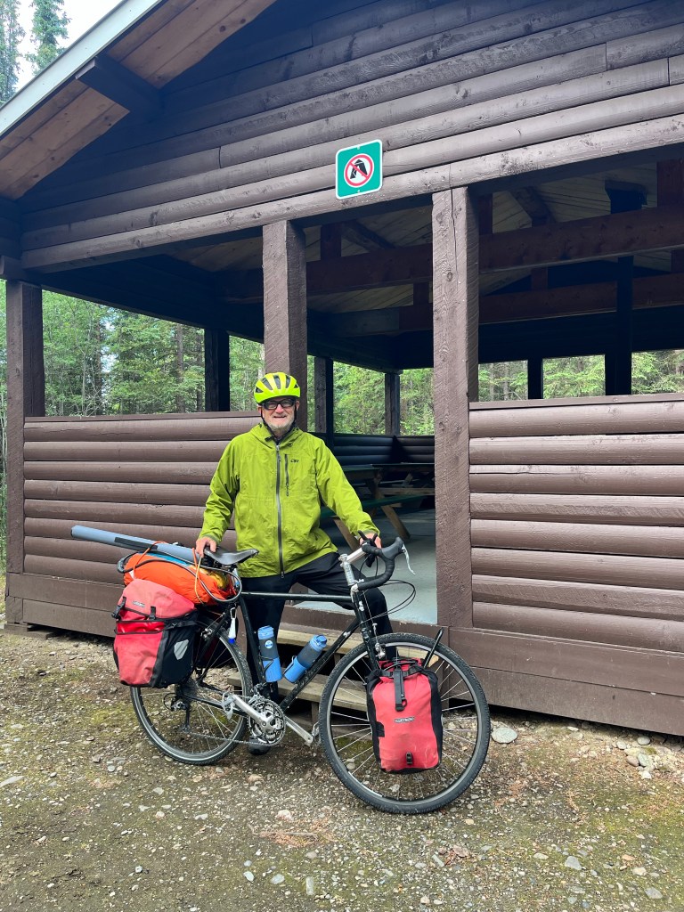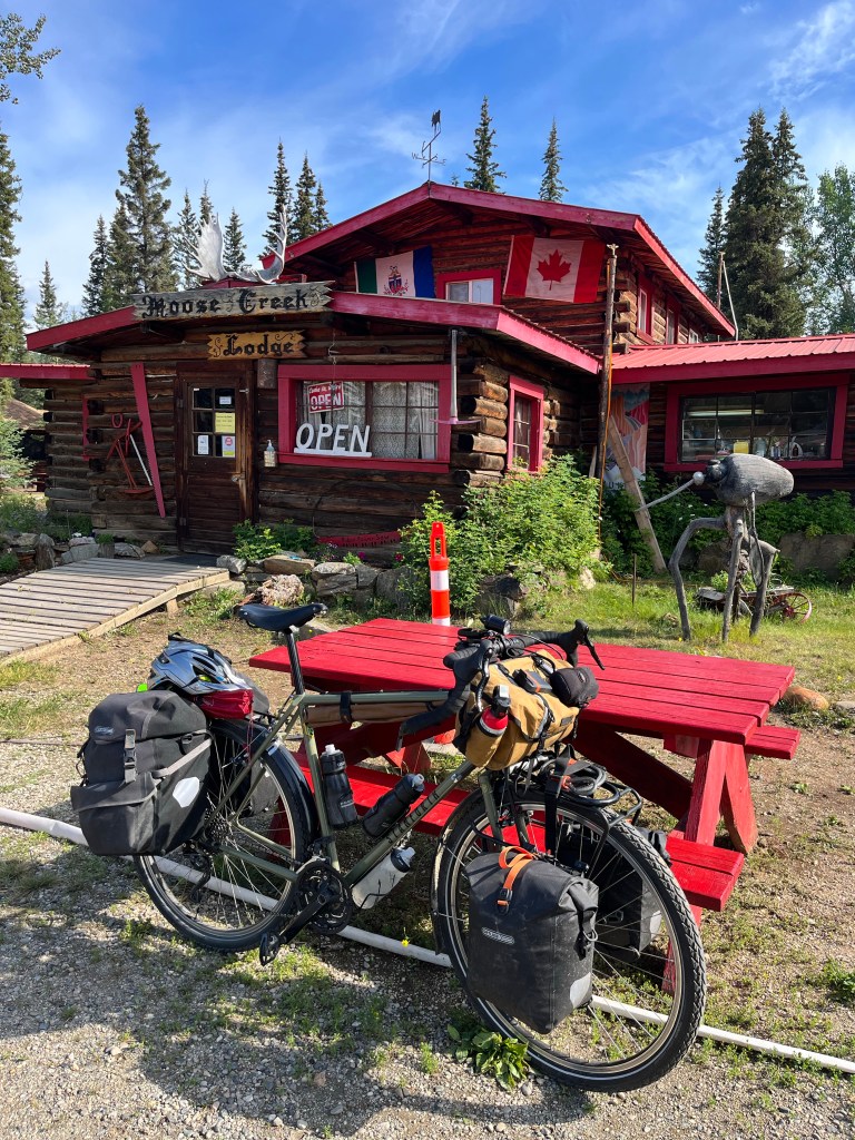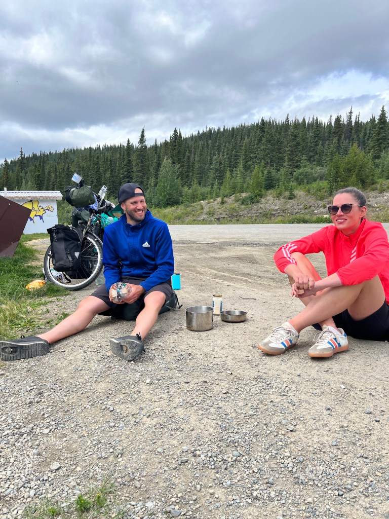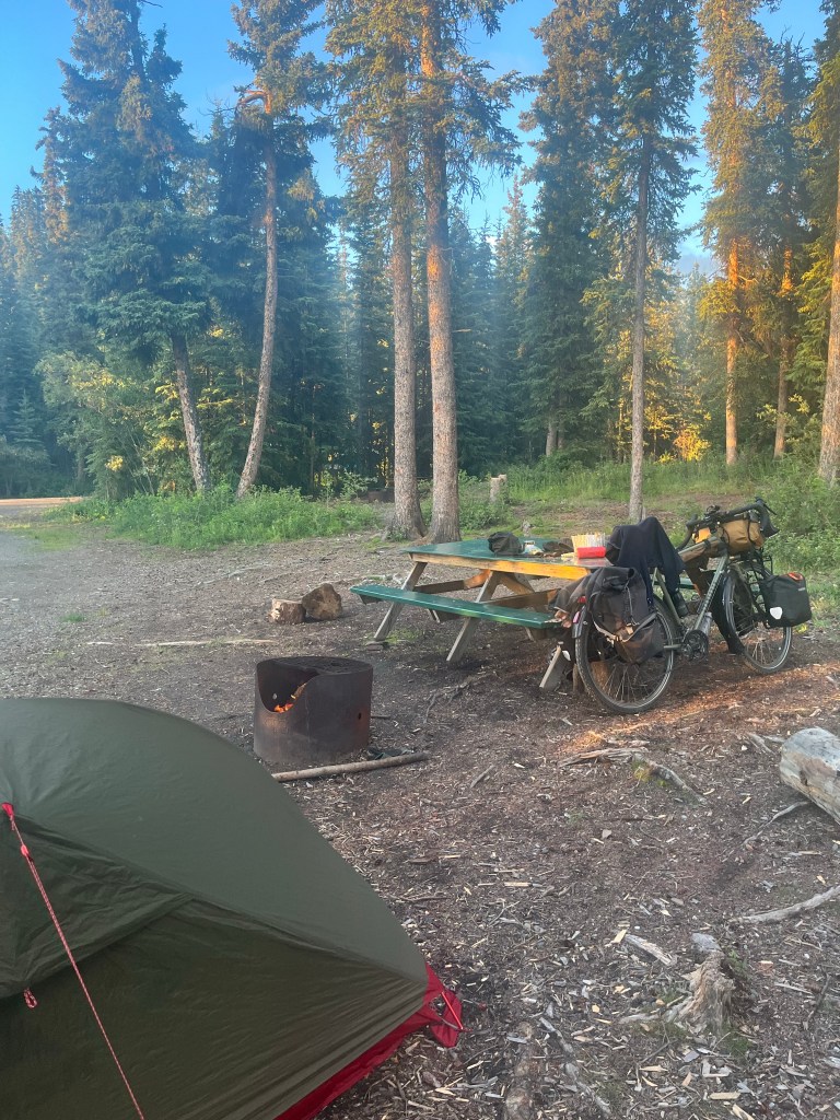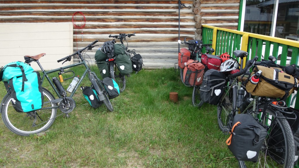 Something cool happened the next day. After camping in someone’s garden, with owners permission, I packed up and got moving first thing. I decided to aim for one of the Yukon campsites 20km down the road for a late breakfast and chill out. When I pulled in Pete was there who I met in Dawson and he was with a couple from Germany on a long bike tour too.