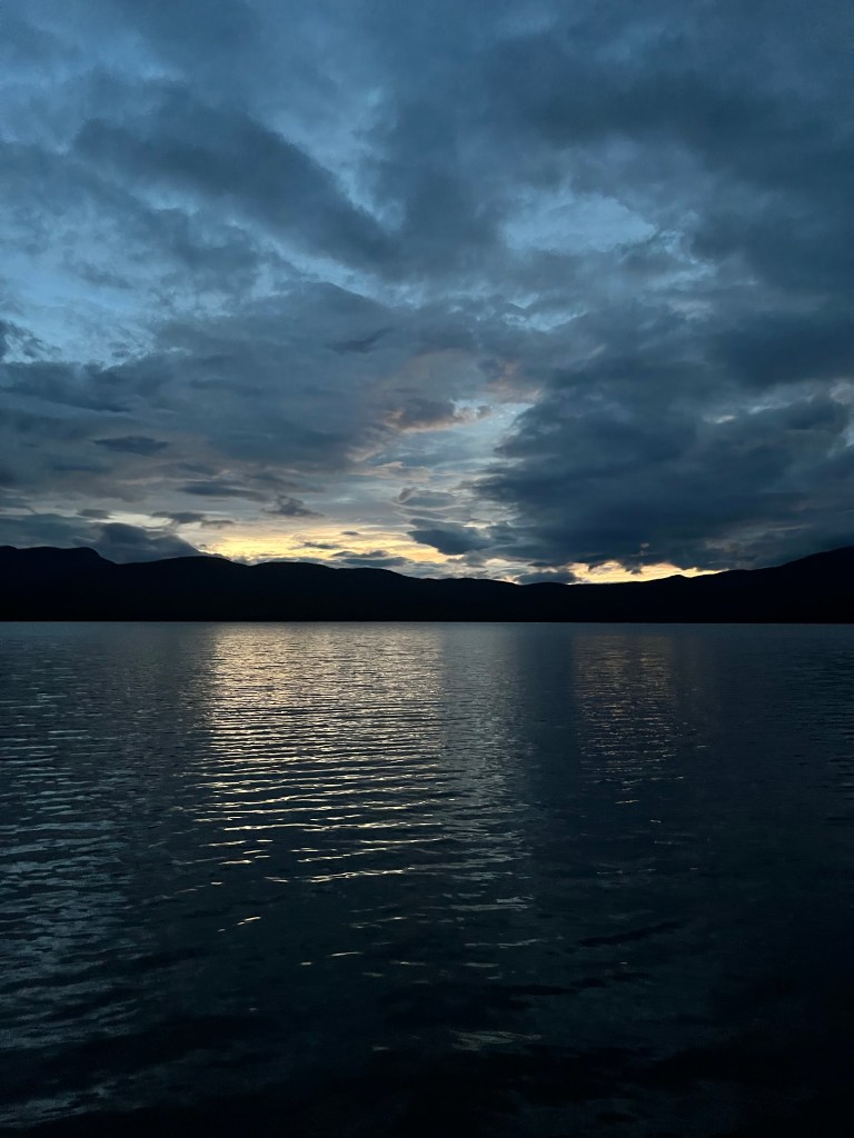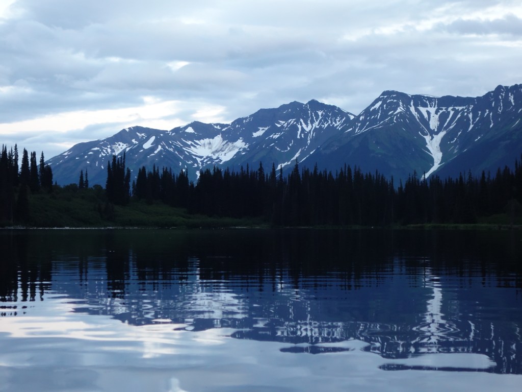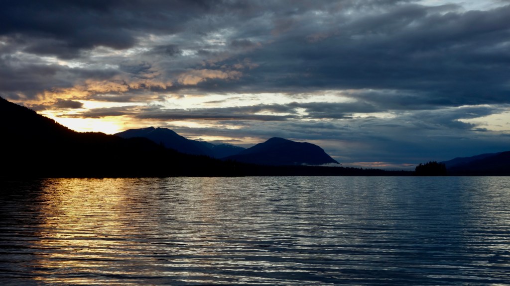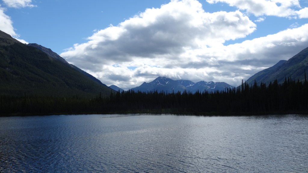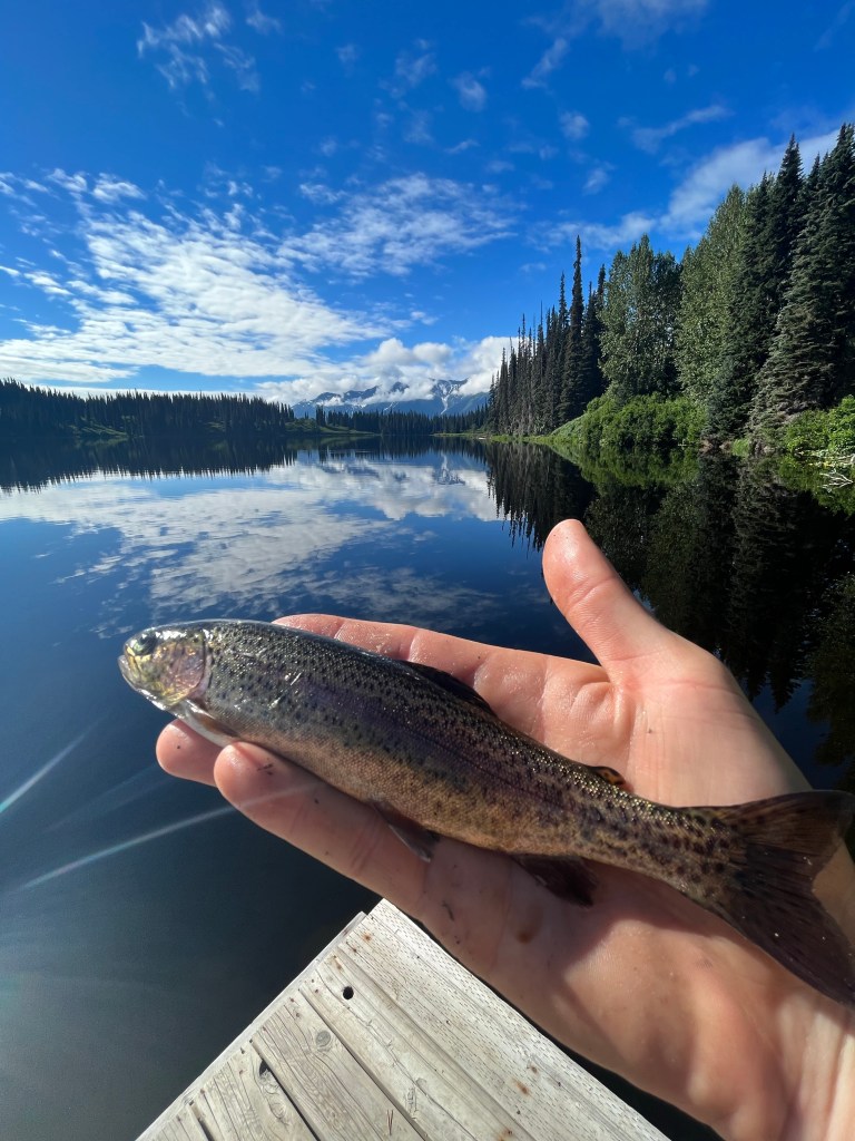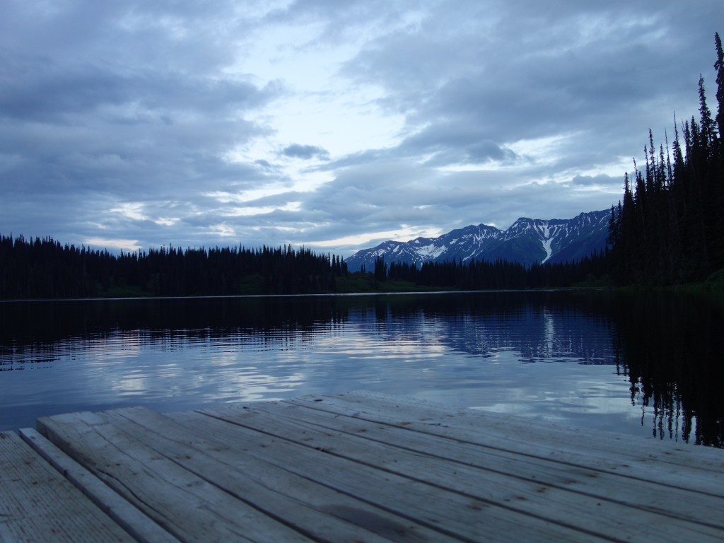 That evening the road section was beautiful as it meandered closer to the Cassiar mountains. The river was opening out to various lakes too and I spotted a perfect fishing spot down off the road. I got down there and set the rod up, with a bit of perseverance I managed to catch a decent size trout. That was tea sorted.
