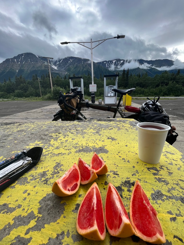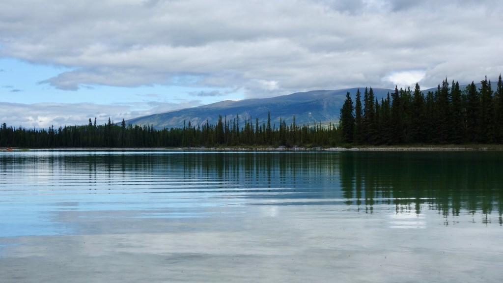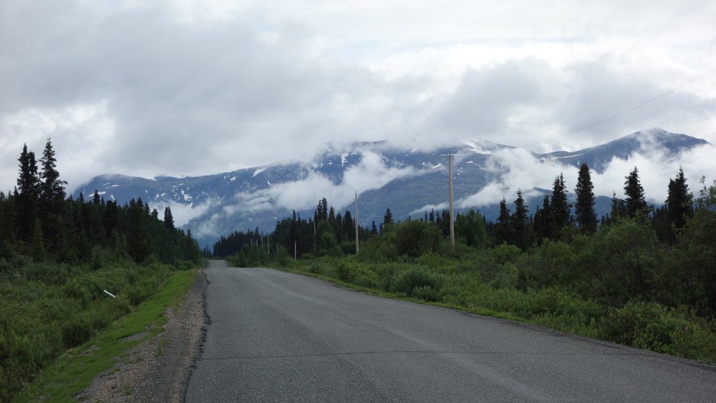 I’d also been warned that there weren’t many resupply points, it’s really not littered with cafés and shops so before leaving Watson Lake I loaded up with rice and beans at the supermarket. Sat outside the shop I made note of the potential food points along the way whilst scoffing a tub of yogurt and fruit for second breky. Bike touring is partly an eating contest and it’s less fun if you’re not getting enough calories so it becomes a focus a lot of the time.