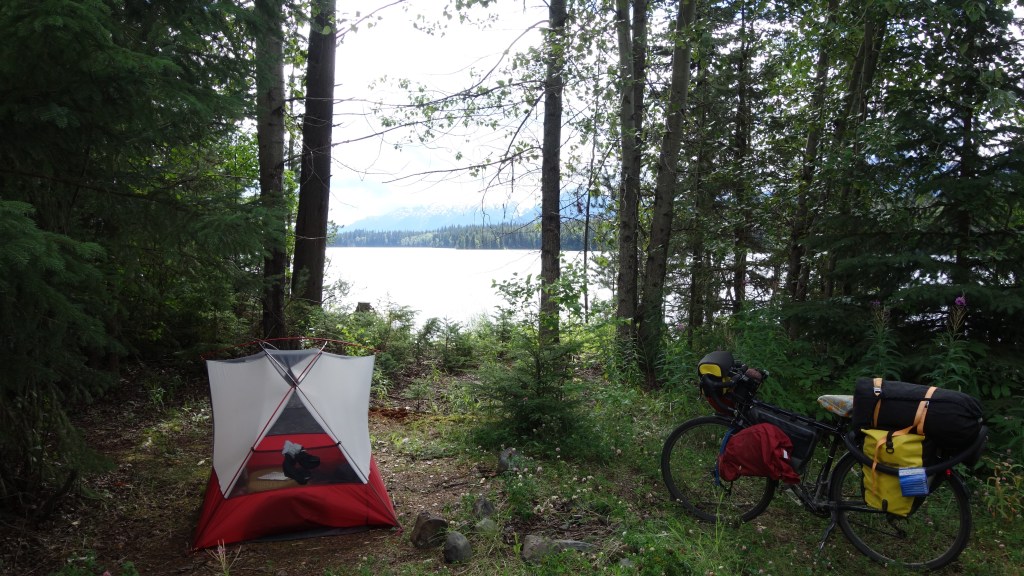 I got the buzz back to pedal again after a day off and had a great days ride though to basic campsite on Kinaskan Lake. The provincial park areas are nice but the catch is that a basic pitch is the same price wether you’re in a big motorhome or on a touring bike. There were no pitches left but the warden said I could camp in the day use area and asked me to pay $25 anyway. Cheeky, I thought but I’ve had my fair share of cheeky free nights. It could have been better to ask around and share a pitch again but I was very happy with my little spot by the lake.