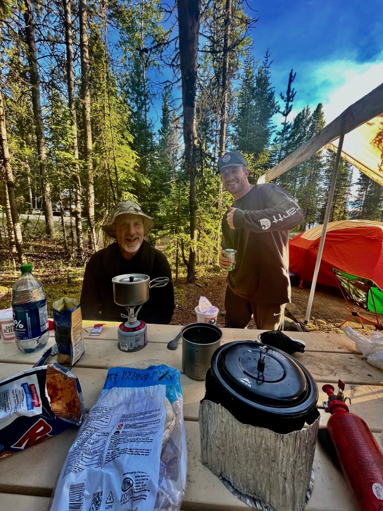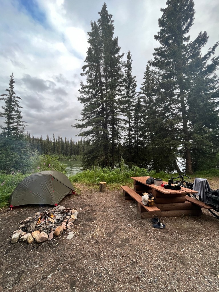 This is where I met Kingston, he was touring north to the top on Canada on the Dempster highway. He had a job at a camp near Inuvik lined up for winter there too which is next level hardcore. I totally forgot I still had two beers in the bag from Dease Lake (the shop would only let me buy a 6 pack) and they were still cold from the grim morning! I happily handed him one and his face lit up startled that I was carrying cold beer on the bike, it was unusual.
