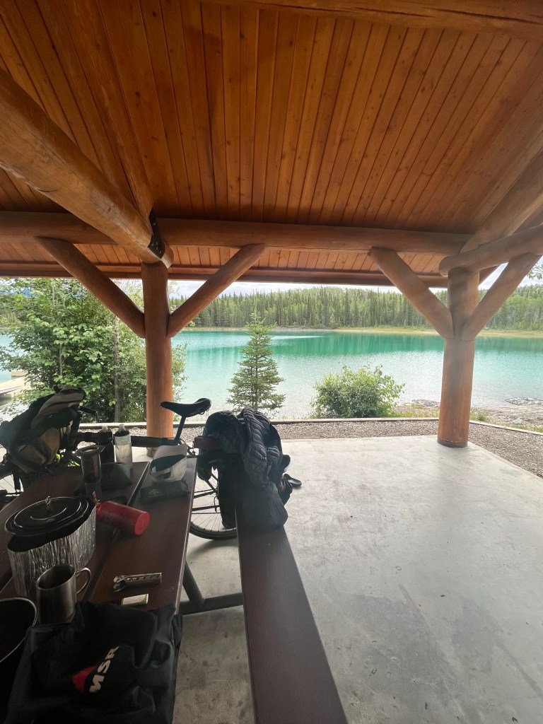 Riding on the next day the road continued through beautiful scenery but I was feeling shattered again. The little place called Dease Lake was a welcome rest point, I booked myself into a campsite there for two nights and had a cheeky day off. It was nice being somewhere social and a stunning place for a stop, another huge crystal clear lake where the Dease River opens out.
