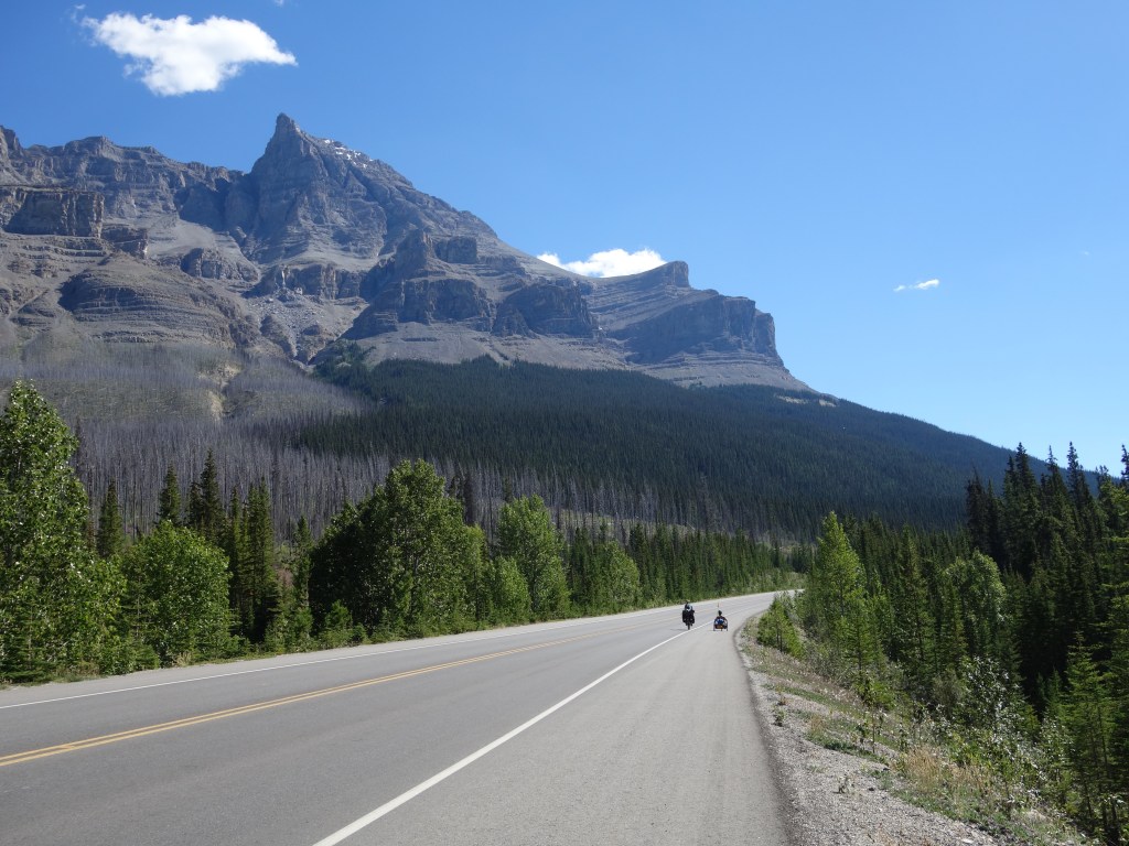 I rode on from Jasper with Nicolas, a lad who was backpacking around Canada through the summer. We met at the campsite and he fancied a pedal out so hired a mountain bike to join me. He warned me he’s not been on a bike in a while but there was no hurry for me. It was a tad windy and wasn’t long before Nicolas was suffering a bit on the climbing. I felt a little smug waiting at the top on the loaded bike but it was soon knocked out of me when I was playing about on his rental. Forgot they have the brakes set on different sides over there so my wheelie attempt ended up off the back and I was on my arse. Smooth.
